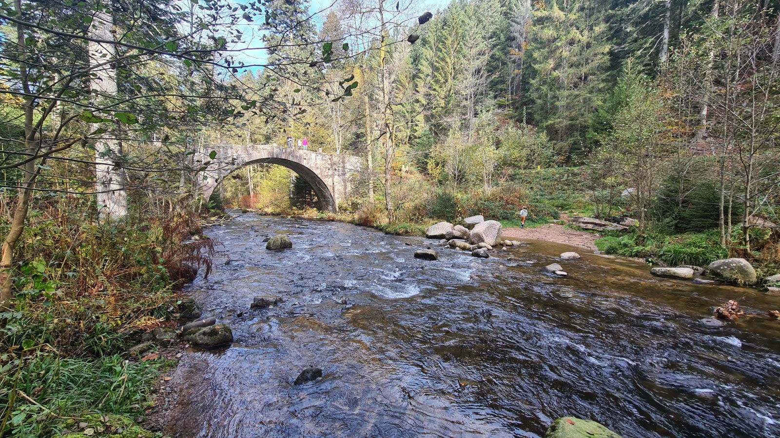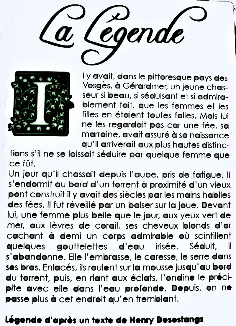 Petit pont de pierre typique, au bord de la rivière Vologne, entre Gérardmer et Xonrupt‑Longemer Le pont dit Pont des Fées est inscrit au titre des monuments historiques par arrêté du 11 février 1972